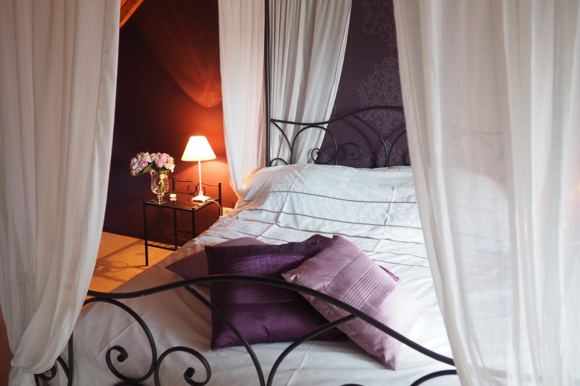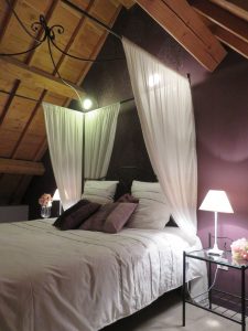 La Chambre violette, au 1er étage dispose d’un lit de princesse, à baldaquin, en largeur 160cm.
