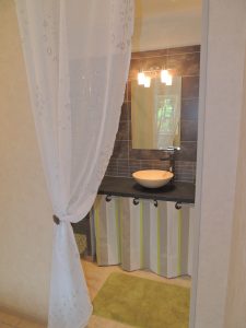 La salle de bain est équipée d’une douche de plein pied, d’un lavabo et d’un toilette.