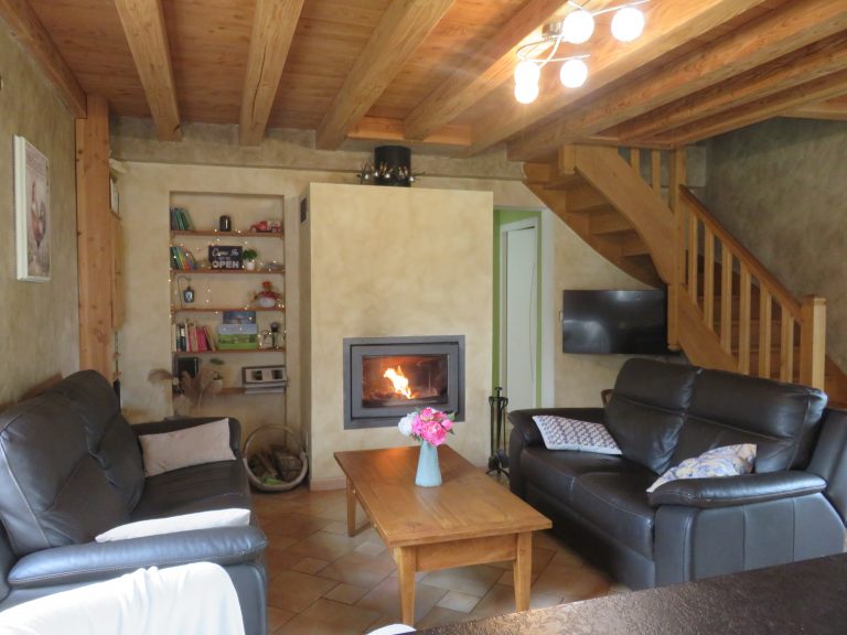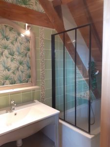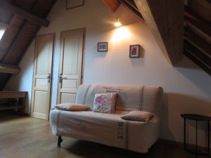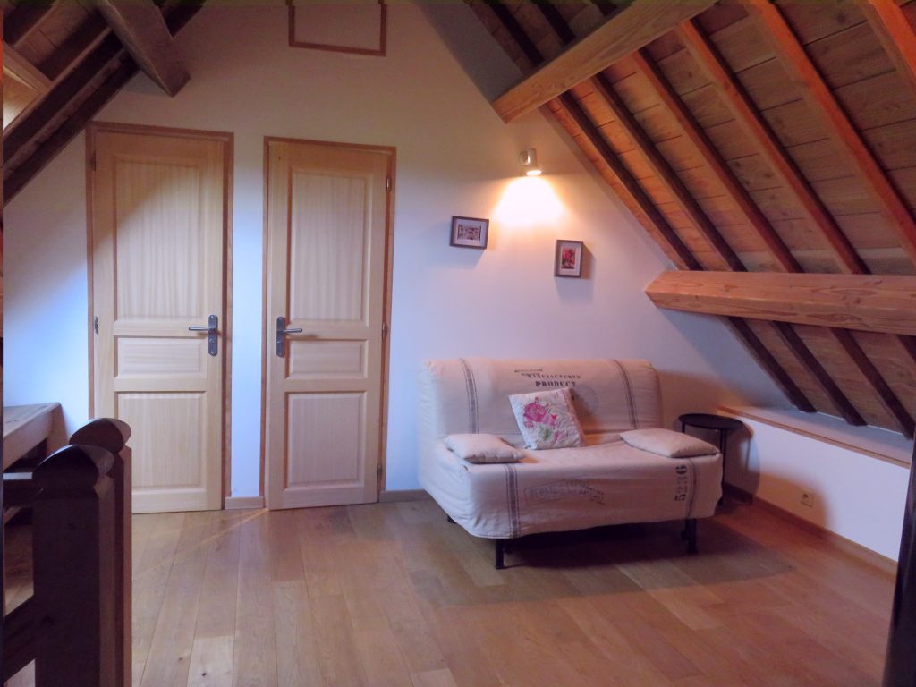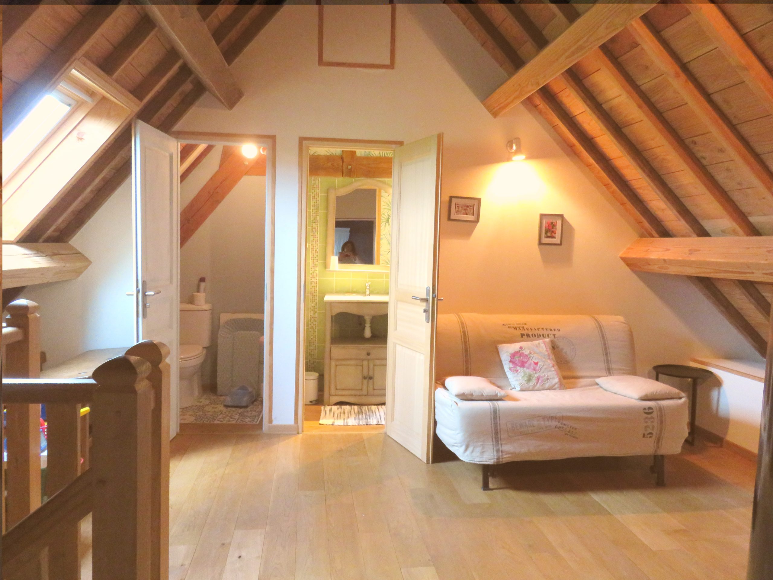 La pièce palière côté cheminée est équipée d’un lit BZ de 140cms. La salle de bains adjacente possède une baignoire et un lavabo. Le toilette est séparé.
